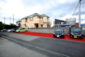 ④ 駐車場に入って右側、庇(ひさし)より手前の駐車場(写真赤色部分)がお客さま用の駐車場です。↓